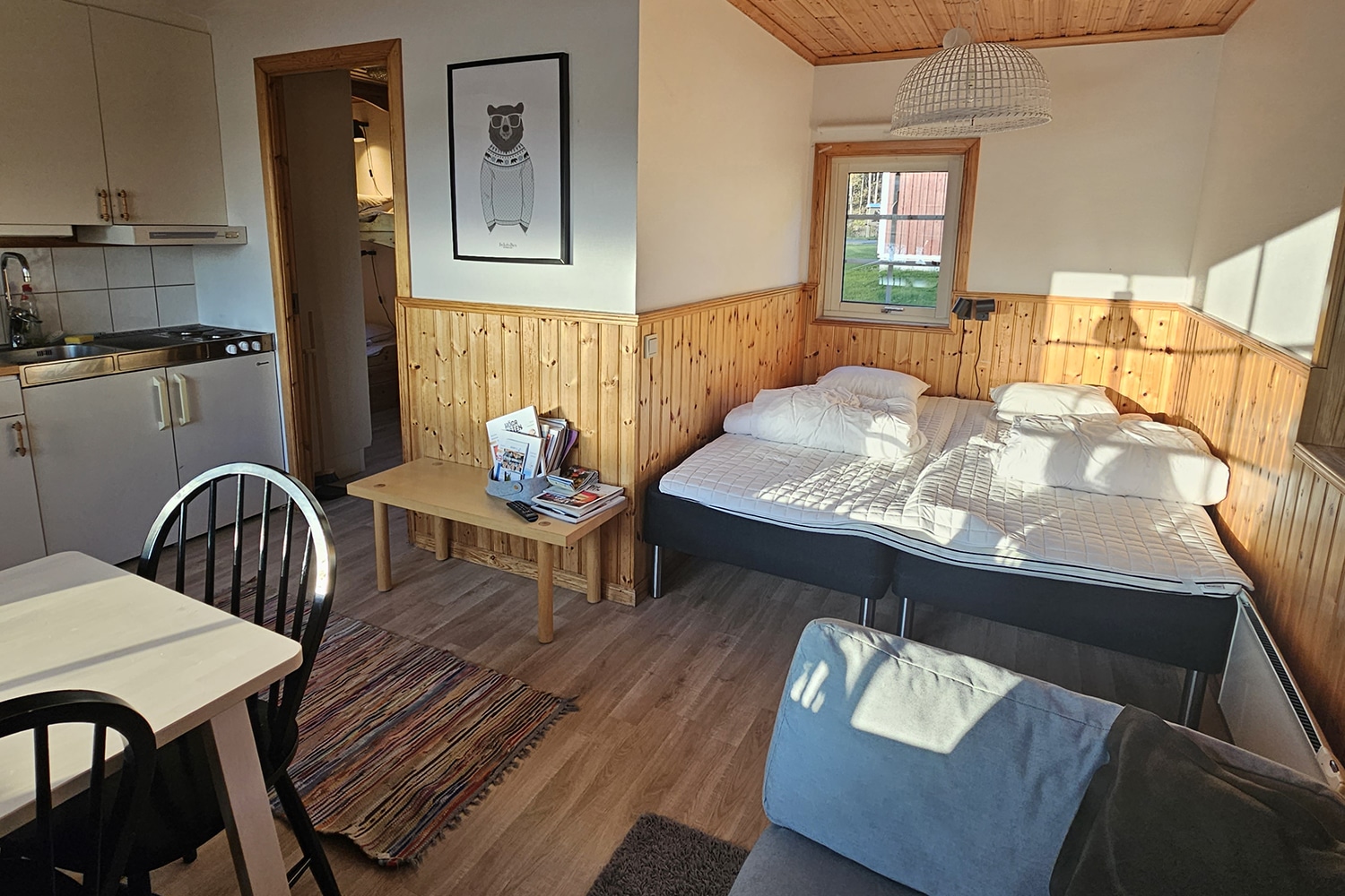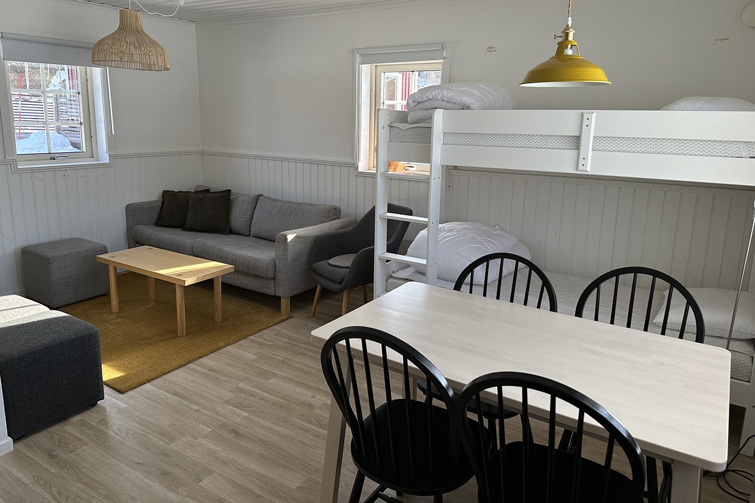 I sovalkoven finns två våningssängar.